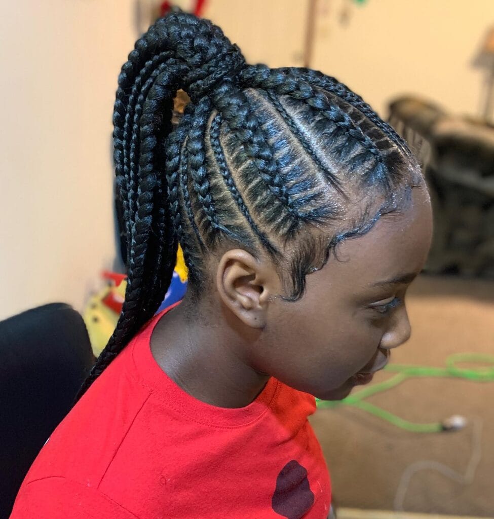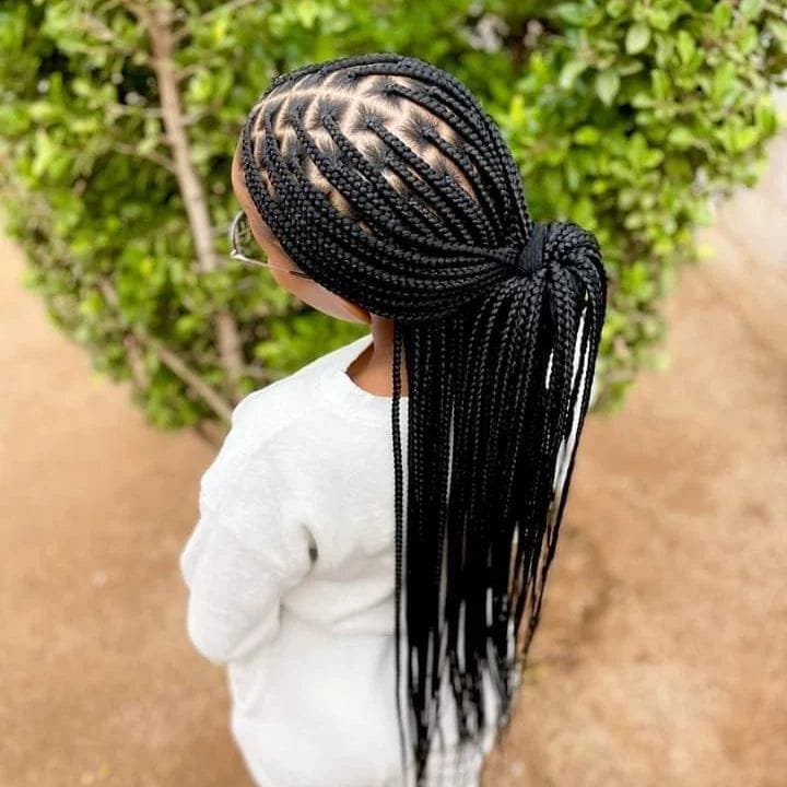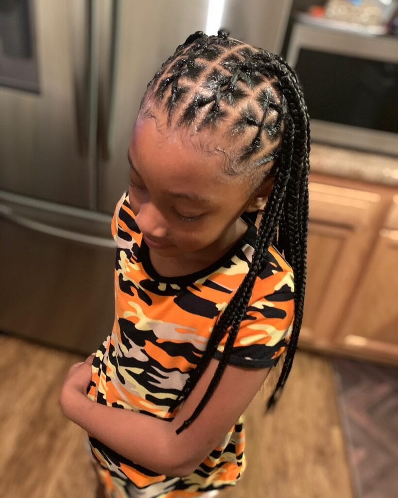 Un mélange de tresses épaisses et fines crée un contraste unique et élégant. Cette coiffure tressée droite est audacieuse, tendance et parfaite pour les enfants qui aiment les coiffures originales. Elle offre un look soigné et durable qui dure des semaines. Un choix idéal pour les enfants qui aiment les coiffures protectrices avec une touche créative !