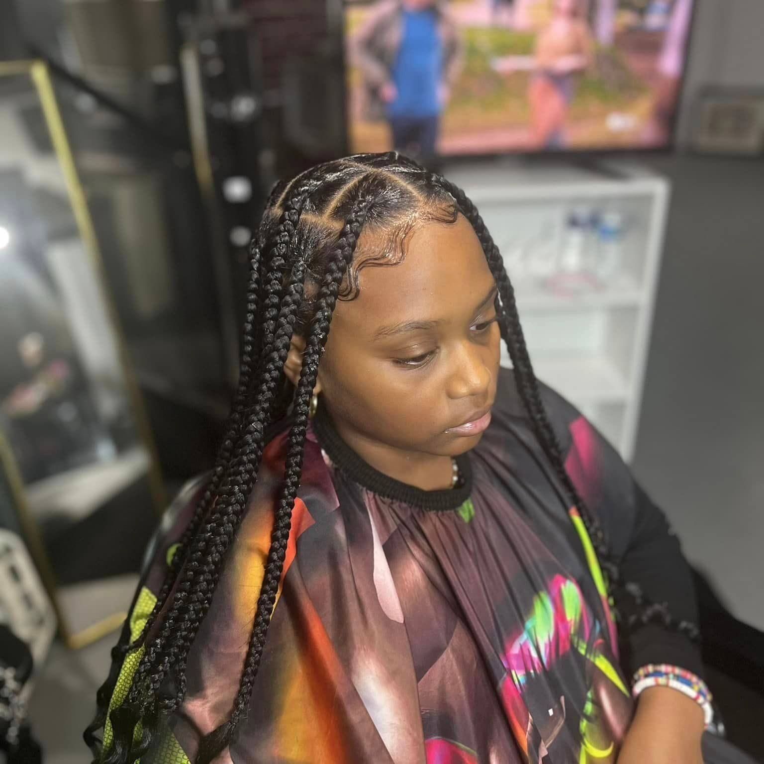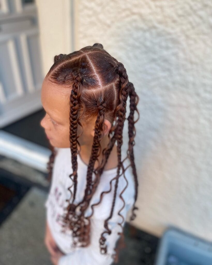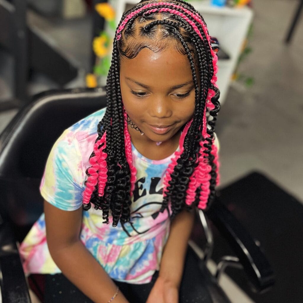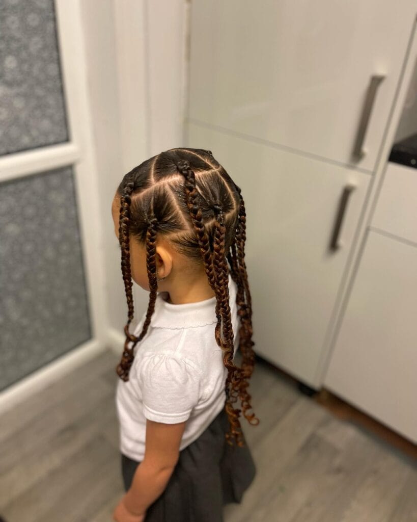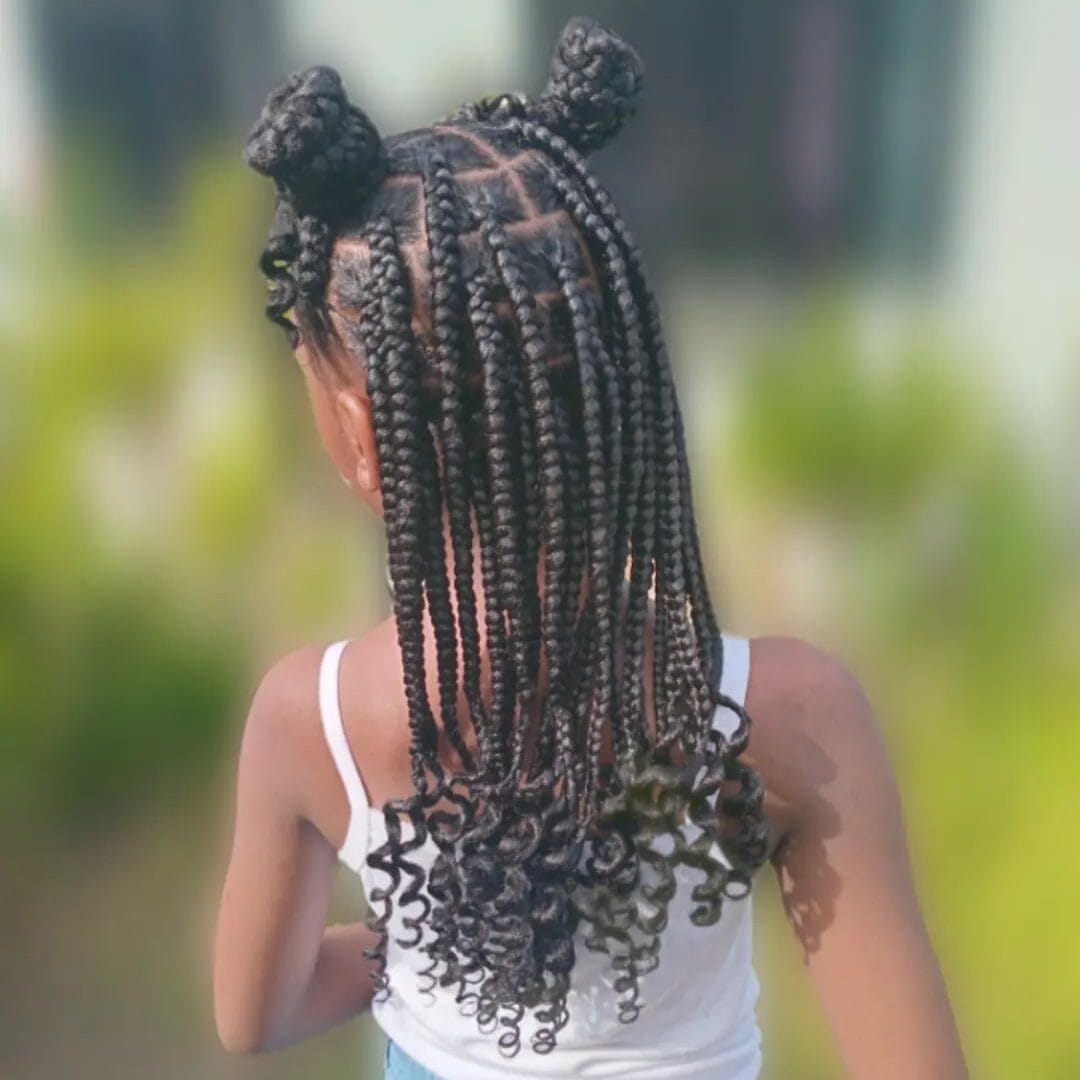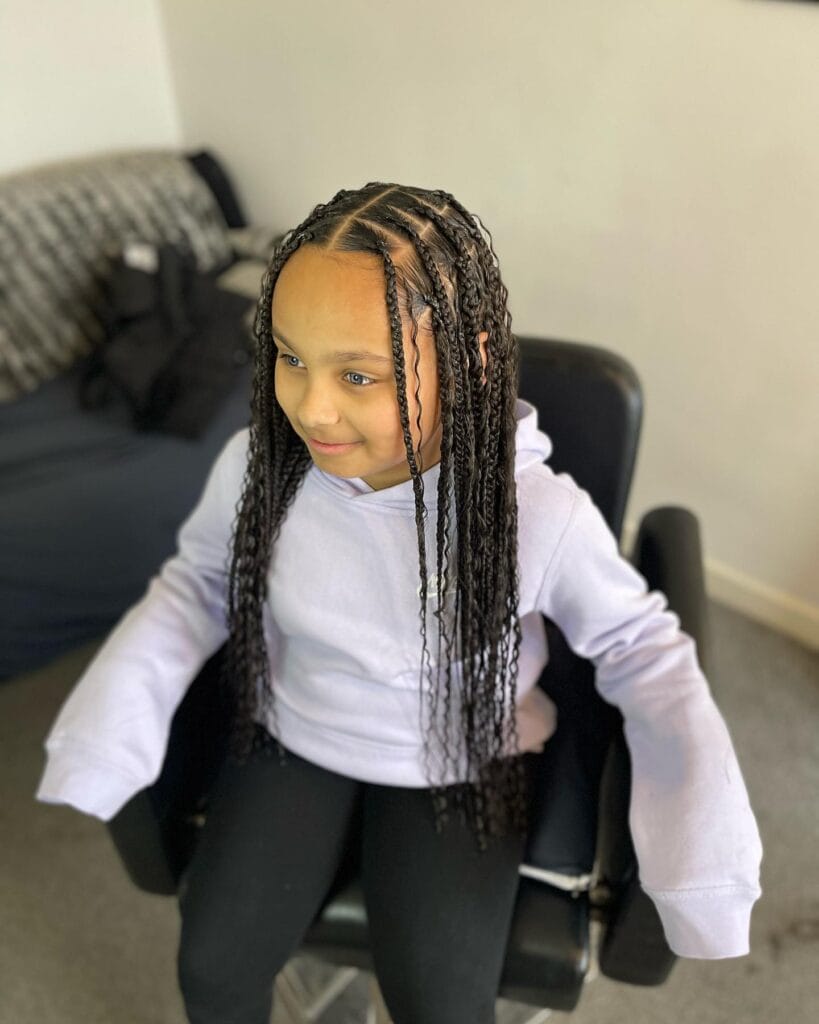 Ce style intemporel associe des tresses box braids lisses et soignées à des boucles rebondies aux pointes. Les boucles apportent une touche de douceur et d’élégance, parfaite pour les occasions spéciales ou au quotidien. Légères et protectrices, ces tresses garantissent des cheveux impeccables pendant des semaines. Une option mignonne et stylée pour les enfants qui aiment les coiffures qui durent !
