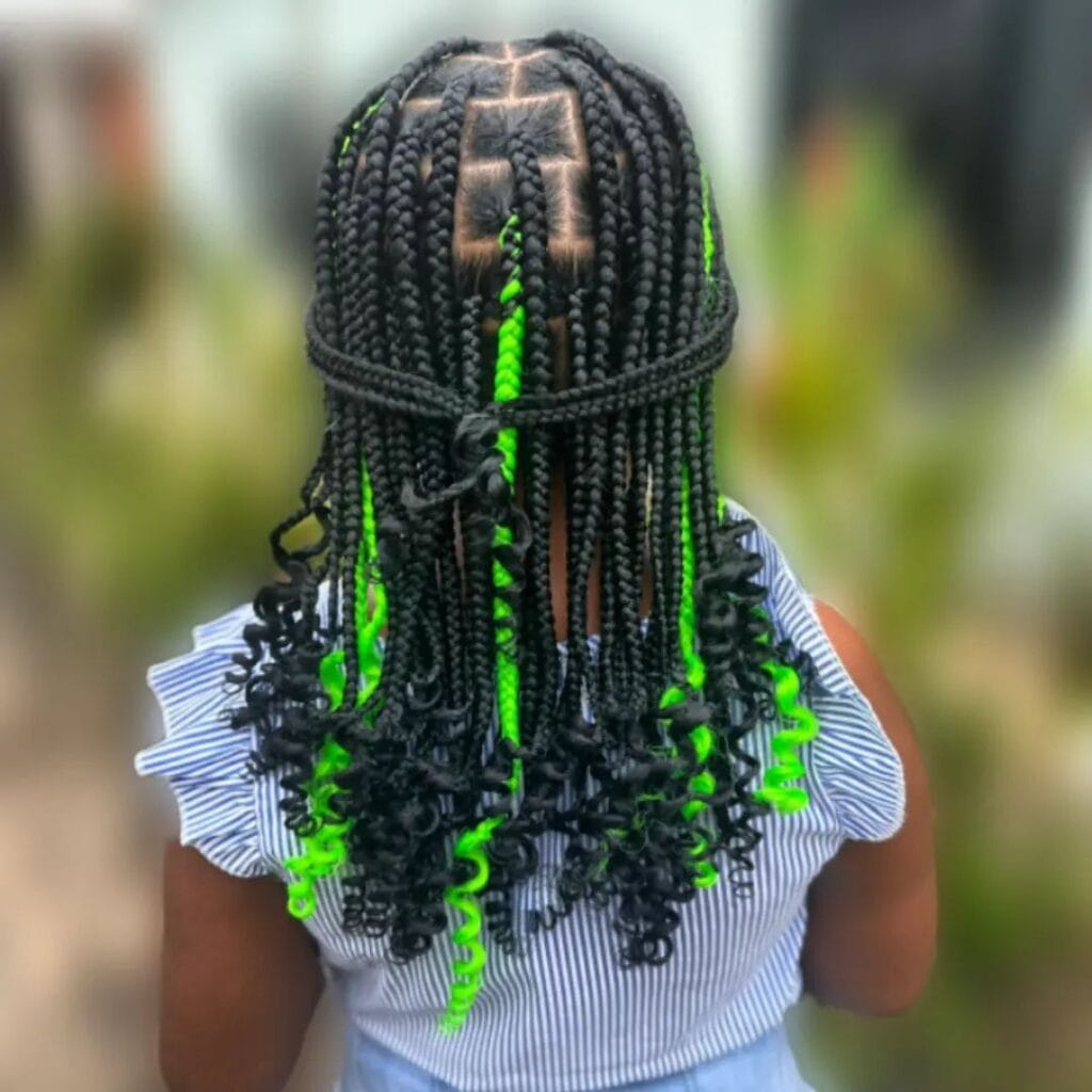 Une façon amusante et élégante d’ajouter de la couleur à vos cheveux, ces tresses noires présentent des sections vert citron visibles. Les touches de couleur dissimulées rendent cette coiffure unique sans être trop audacieuse. Parfaite pour les enfants qui souhaitent un look tendance sans tresses colorées. Une option créative et stylée qui ne passe pas inaperçue !