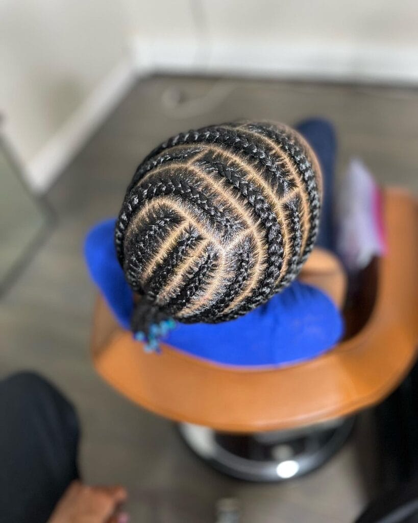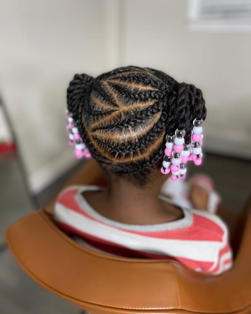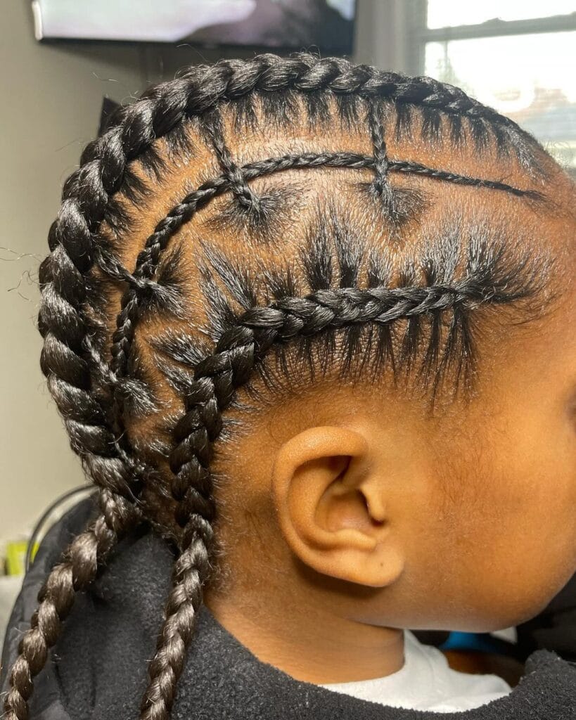Ce style créatif se compose de tresses croisées qui ajoutent une touche sophistiquée et élégante. Ce motif met en valeur la coiffure tout en la gardant soignée et facile à coiffer. Parfait pour les enfants qui aiment un look tendance et protecteur qui dure. Ajoutez des perles ou des manchettes pour plus de style !