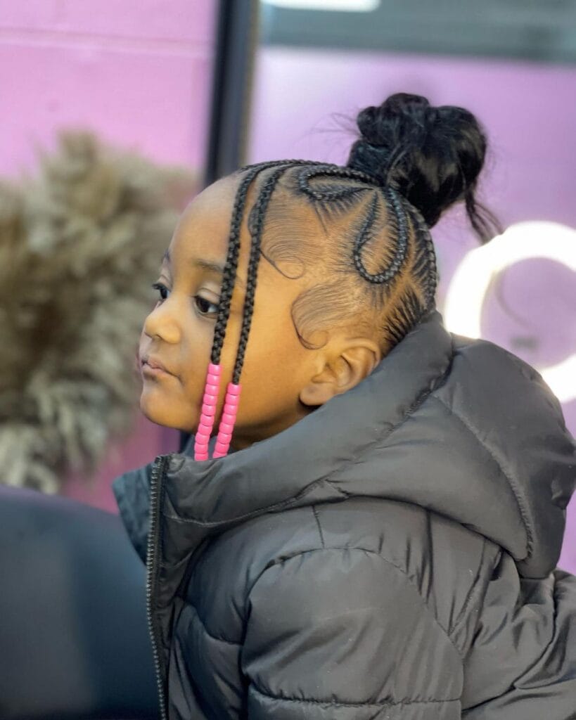 Une coiffure amusante et dynamique, avec des tresses droites relevées, complétées par une queue de cheval haute et des perles colorées. Ces dernières ajoutent une touche ludique tout en gardant les tresses soignées et élégantes. Parfait pour l’école, les sorties entre amis ou les fêtes culturelles, ce look est à la fois pratique et esthétique. Un incontournable pour les enfants qui aiment les coiffures originales !