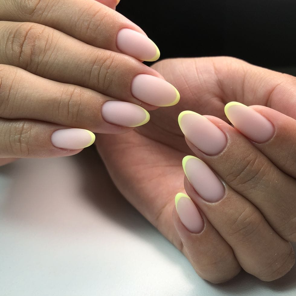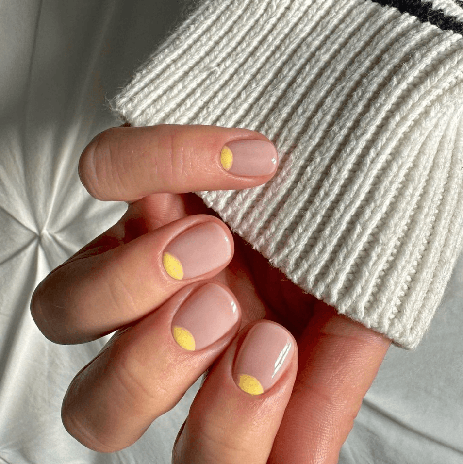 Ajoutez une touche de couleur à une manucure autrement subtile en remplissant des demi-lunes à la base de votre ongle. Le jaune est la star ici, mais n’hésitez pas à explorer d’autres nuances également.
