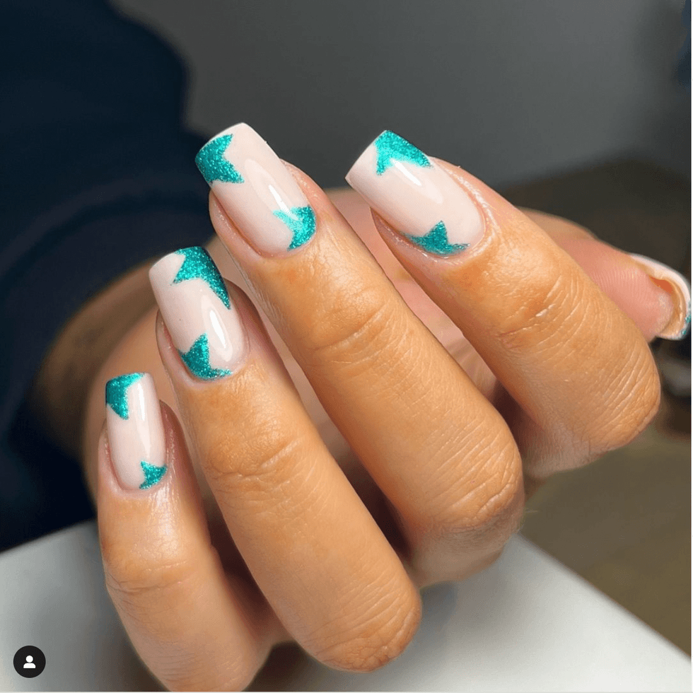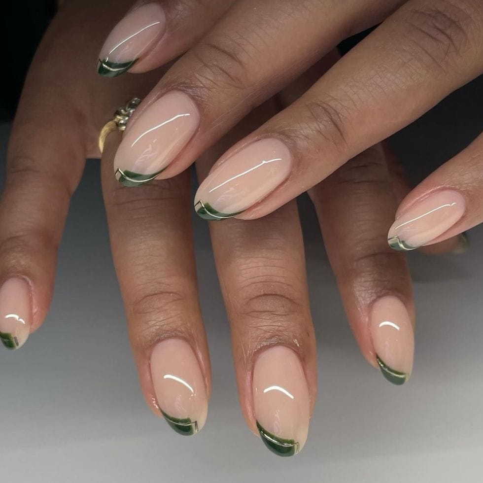 Ce n’est pas tout à fait une pointe française, mais ces élégants accents dorés et verts sur la pointe de l’ongle créent un design d’ongle à espace négatif intéressant.