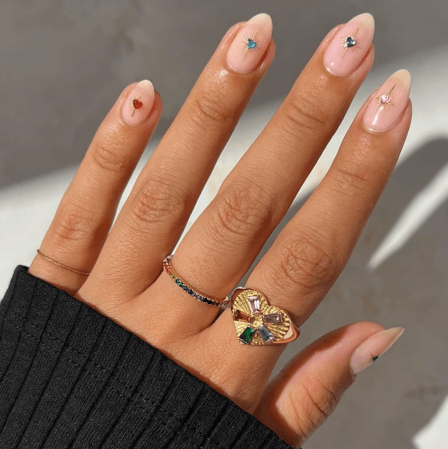 Si vous nous le demandez, ces ongles ont la quantité parfaite de bling. Les bijoux en forme de cœur au centre de l’ongle et l’étoile dorée qui l’entoure sont à la fois accrocheurs et faciles à réaliser.
