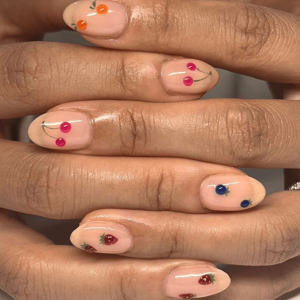 De petites perles aux teintes de gel presque translucides se transforment en fruits les plus adorables avec seulement quelques touches de vernis vert. Ajoutez-les à une base neutre comme on le voit ici ou peignez-les sur une couleur vive de votre choix.