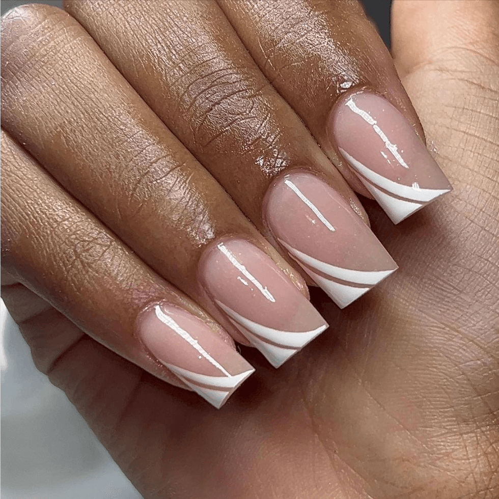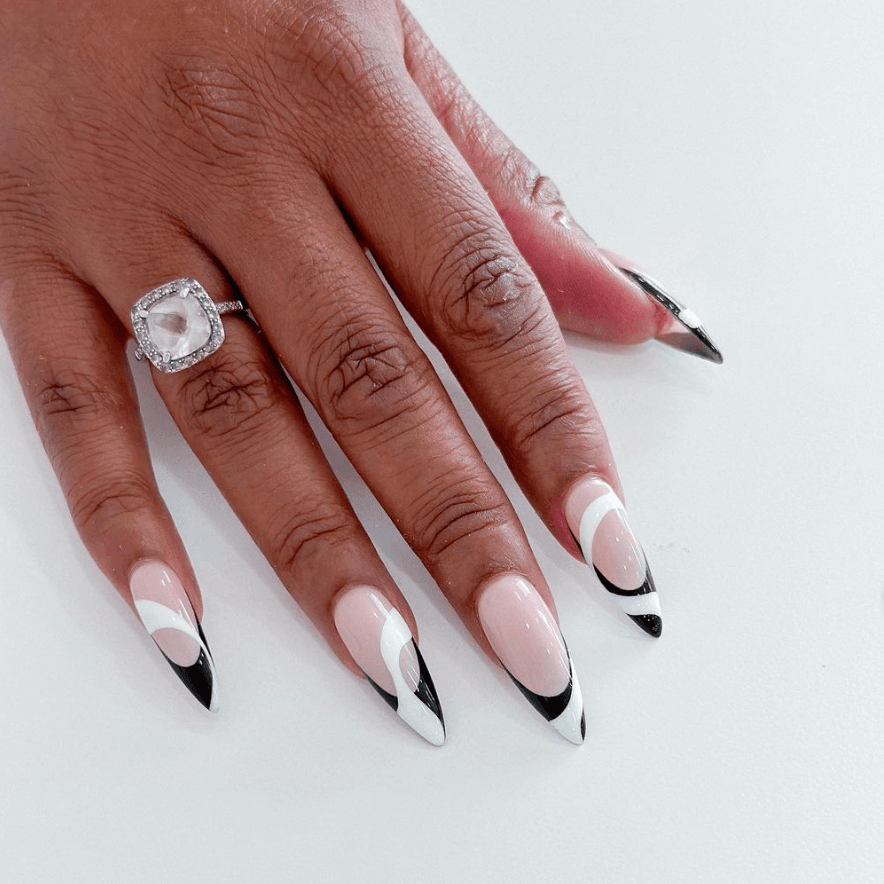 Le noir et blanc classique donnera toujours à vos ongles un aspect chic et sophistiqué. Ces bandes blanches abstraites placées sur une pointe française noire accomplissent exactement cela.