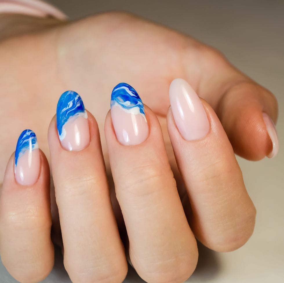 Faites sensation avec ce design innovant. Mélangez simplement les nuances de vernis bleu et blanc sur une assiette ou une palette et posez-les doucement sur une base nude pour un effet de vague déferlante.Publicité – Continuez la lecture ci-dessous