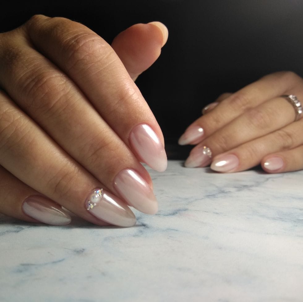 Le chrome surmonté d’accents de perles est la voie à suivre si vous recherchez une version It-girl de la tendance des « ongles en beignet glacés » de Hailey Bieber.