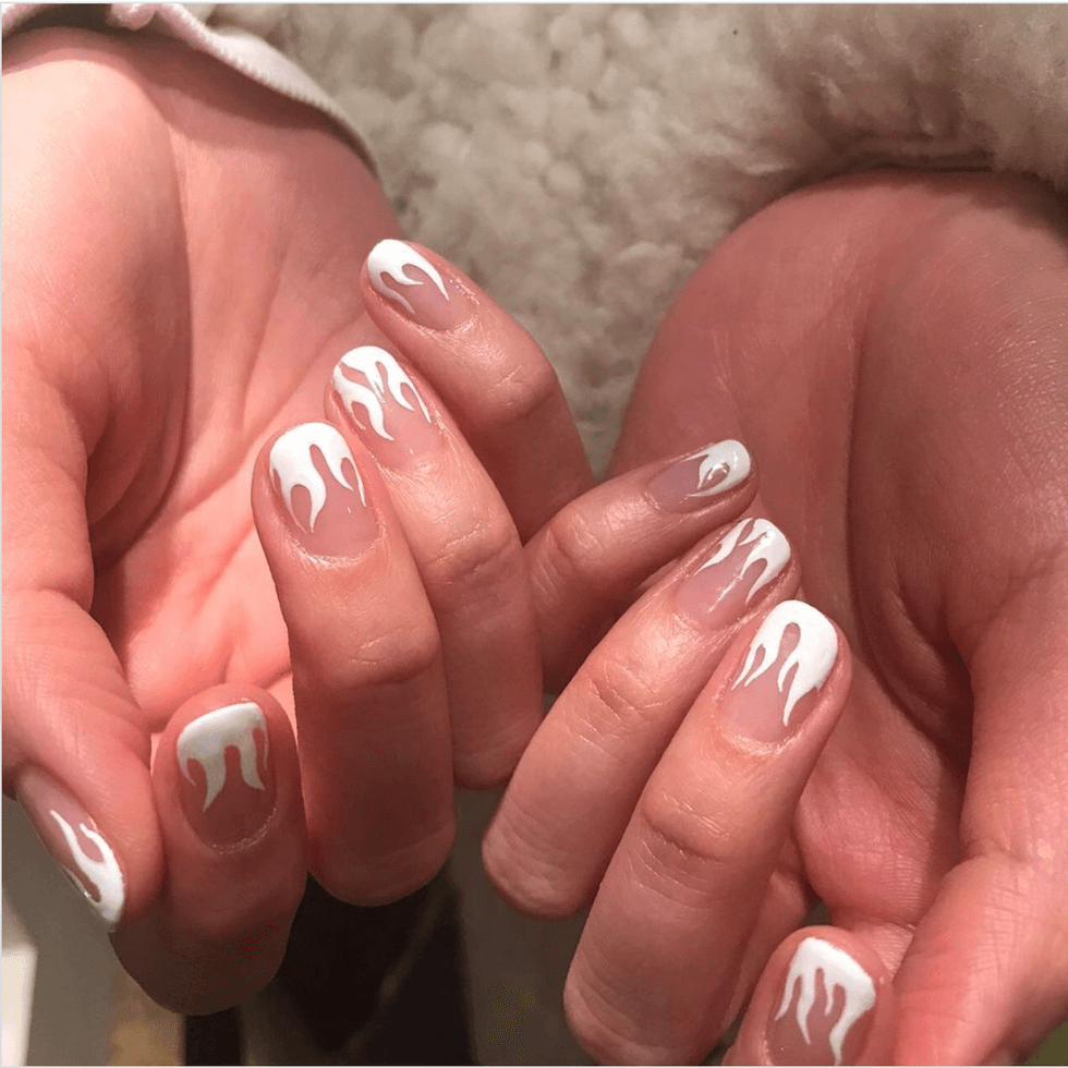 Une nouvelle version d’une pointe française intègre des flammes vives. Essayez ce design en blanc ou mélangez-le avec des couleurs fluo ou primaires.