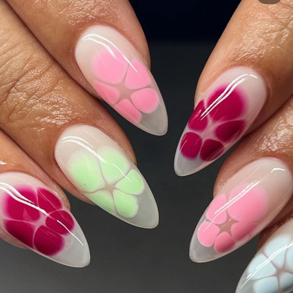 Les couleurs vives font de ce design une option amusante, mais la base de gel fleurie est la véritable star. Lorsque vous disposez cinq points de votre vernis de couleur préféré sur la base, regardez-le « fleurir » tout seul, car les points colorés s’étendront et se disperseront lentement pour créer des pétales.