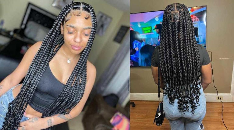 Les tresses jumbo longues aux extrémités bouclées sont parmi les coiffures les plus attrayantes pour un look naturel et éclatant. Ajouter des boucles ou des ondulations à la moitié inférieure des tresses jumbo crée un style volumineux et bouclé.