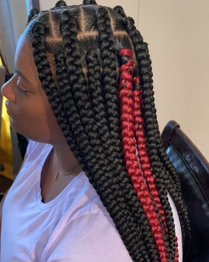 Les longues tresses box braids avec des élastiques colorés sont adorables et rappellent les tresses bubble braids. Le plus, c’est que vous pouvez facilement changer de style. C’est l’une des meilleures coiffures de tresses jumbo longues, car elle est facile et simple.