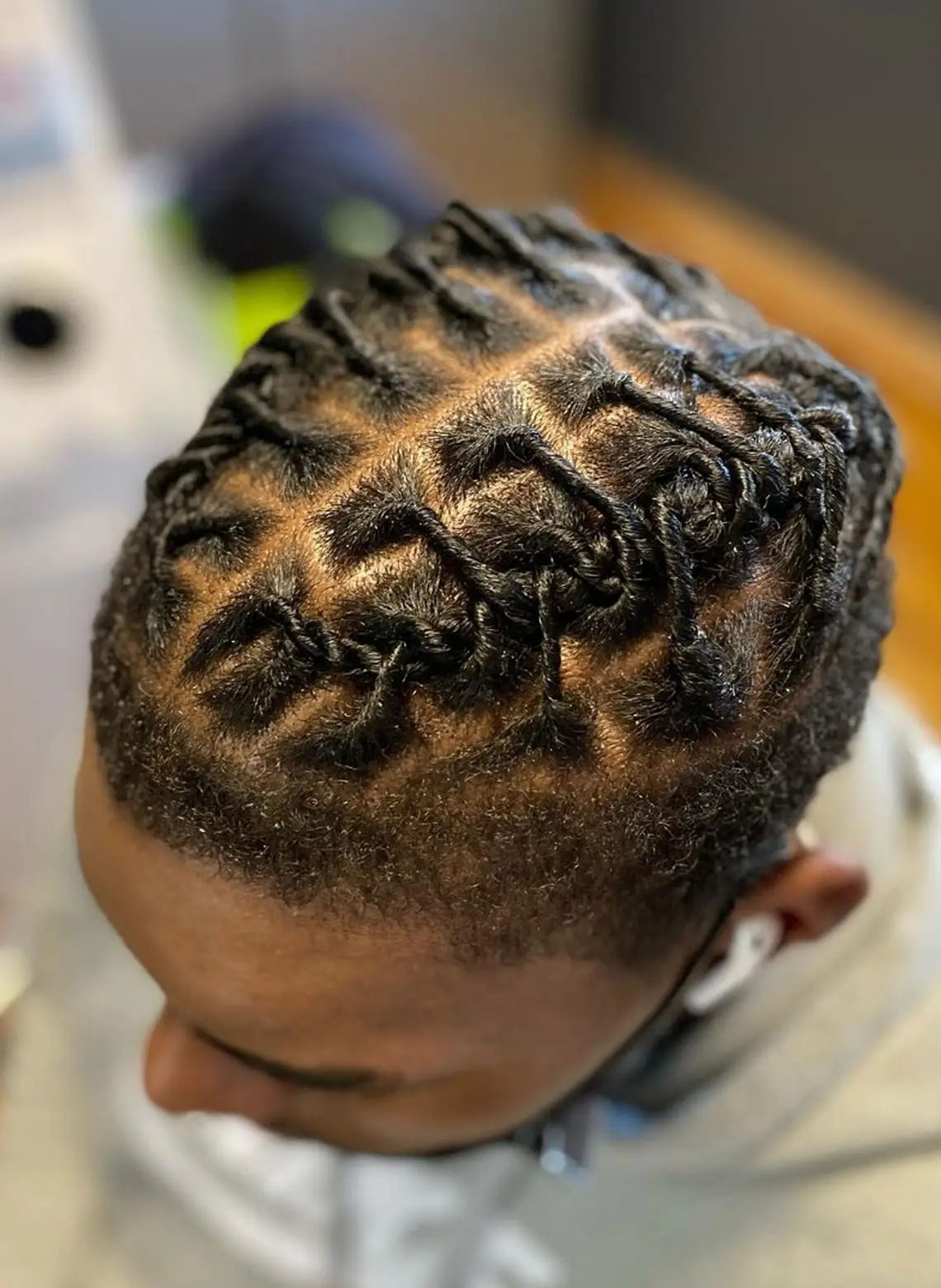 Les tresses croisées sont une version cool de la coiffure traditionnelle pour hommes qui vous permet d’être plus créatif. Votre tresseuse peut tresser vos cheveux sous différents angles et les croiser, vous permettant de combiner différents types de tresses. Ce style est super artistique et parfait lorsque vous souhaitez rehausser vos tresses.