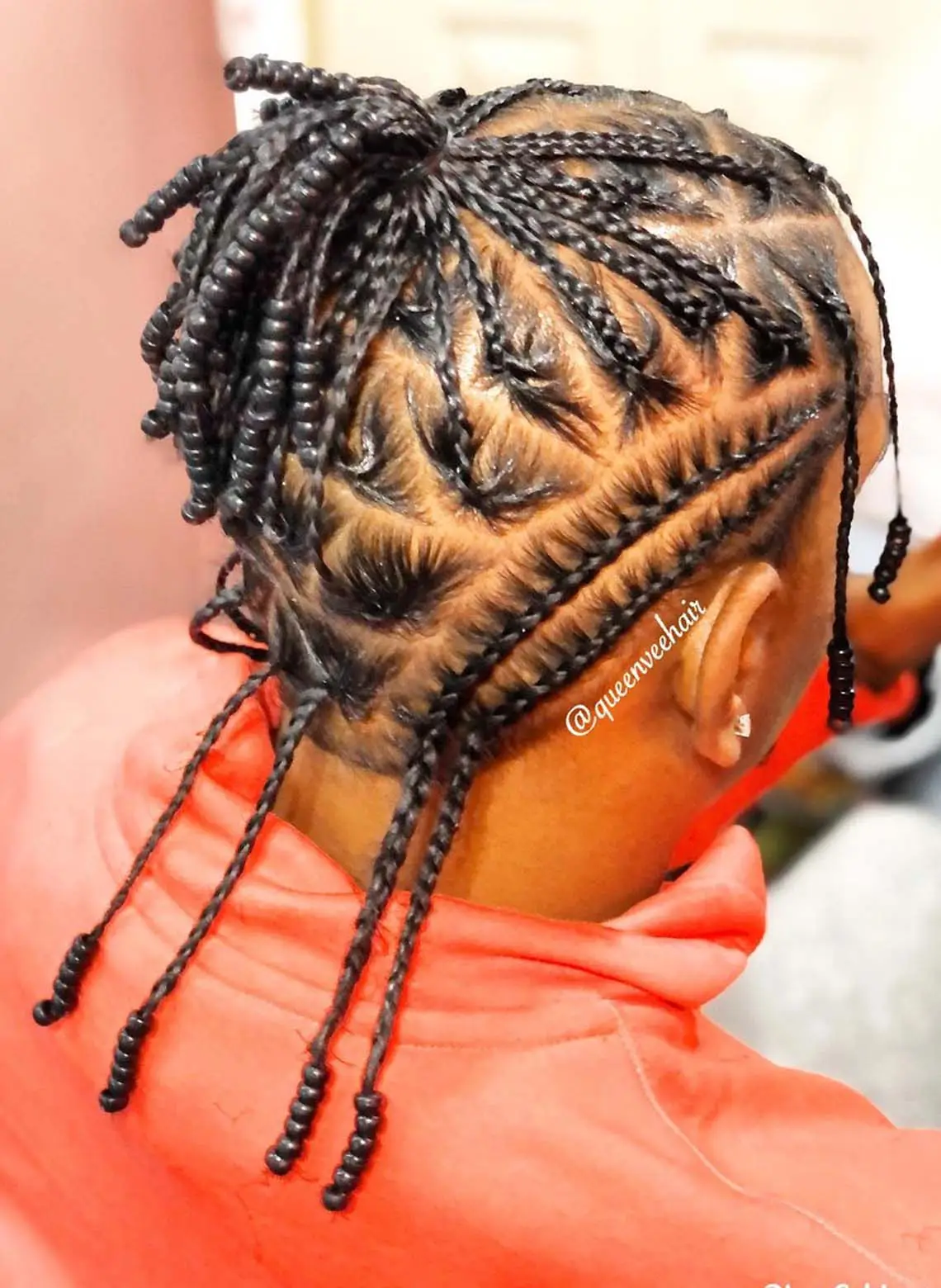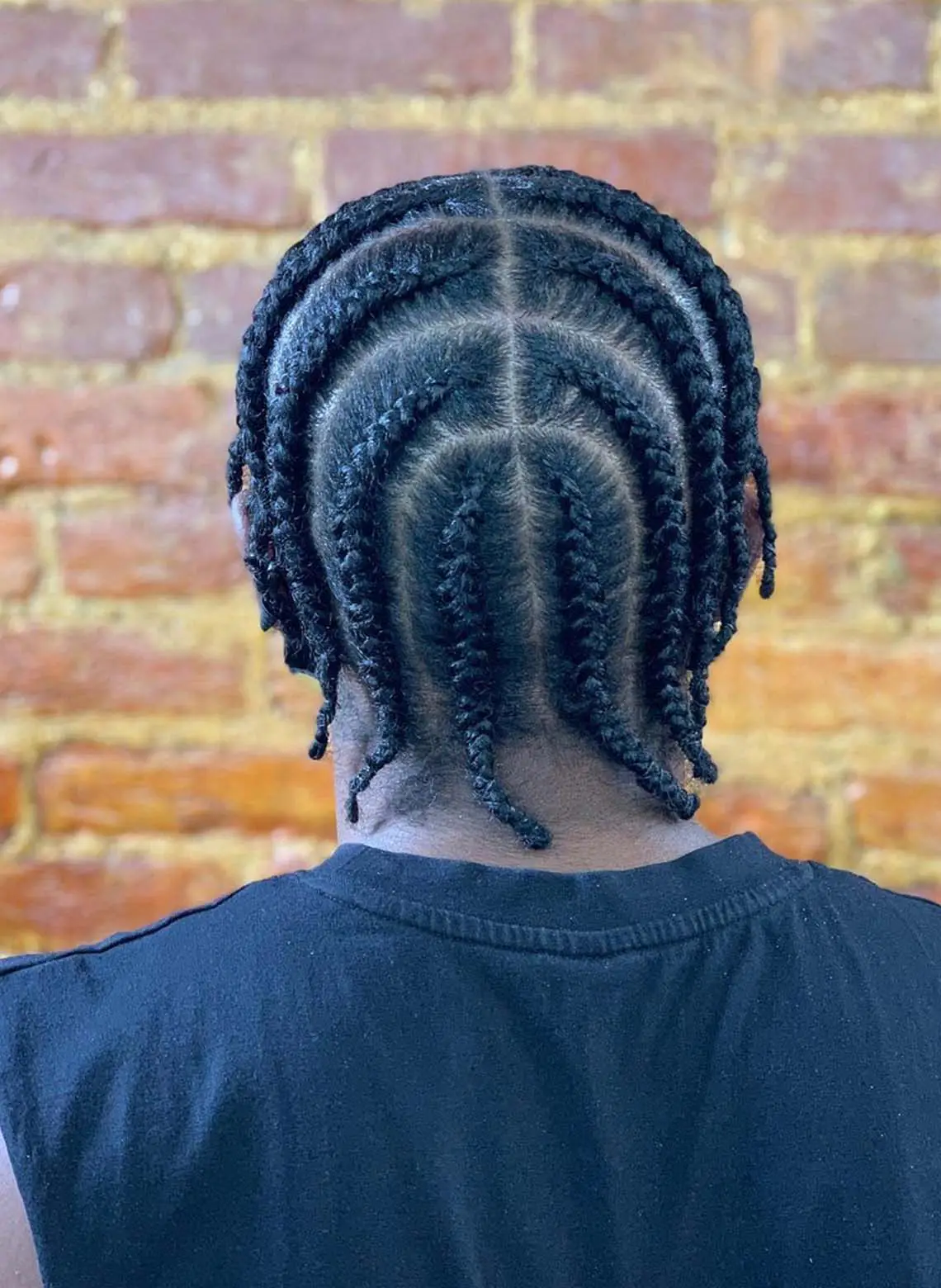 Rendues célèbres par le rappeur Pop Smoke, ces tresses africaines sont tressées à partir du milieu de la tête plutôt que de l’avant vers l’arrière. Ce look est un peu plus décontracté que les tresses africaines classiques et est superbe si vous ajoutez quelques perles à l’extrémité.