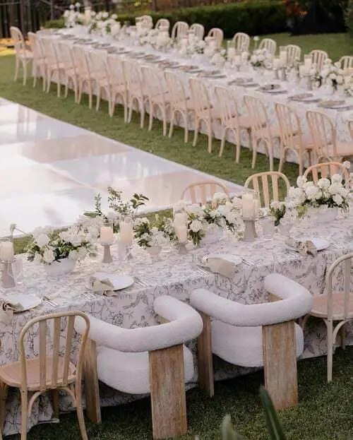 While an all-white wedding theme can be stunning, incorporating subtle cream accents can add a touch of elegance and visual interest. The plush cushioning on the chairs designed specifically for the bride and groom exudes comfort and sophistication. Additionally, the intricate details on the tablecloth demonstrate a thoughtful approach to wedding decor.