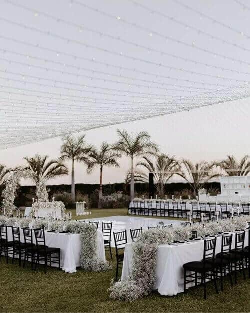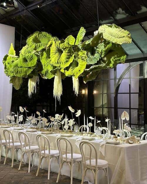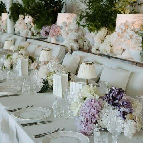 J’avoue une profonde affection pour les plantes, ce qui en fait un élément essentiel dans la conception de mon mariage. Alors que vous vous efforcez de créer un thème entièrement blanc, incorporer des touches de couleur devient crucial. Un moyen efficace d’y parvenir consiste à introduire de la verdure, comme le feuillage luxuriant utilisé ici, qui compense magnifiquement la palette blanche. J’apprécie également la façon dont les longues fleurs blanches sur les tables ajoutent de l’intérêt visuel et de la hauteur, créant ainsi un affichage visuel époustouflant.