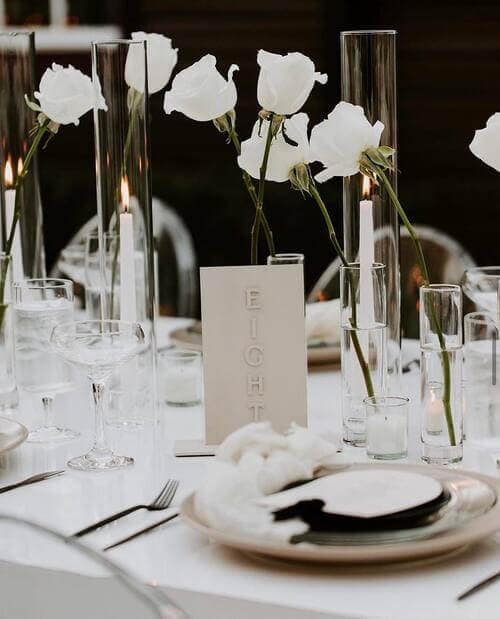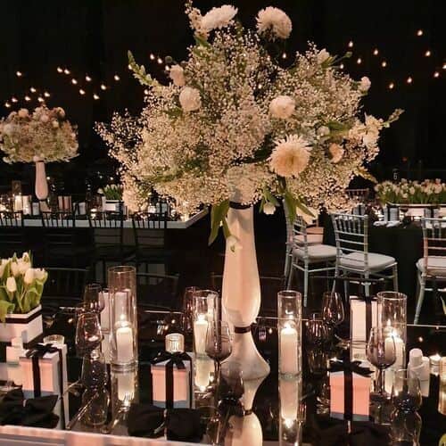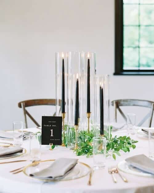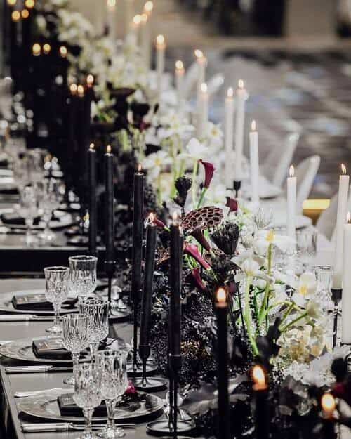Pour garantir la sécurité de vos bougies, pensez à les placer dans de grands vases pour éviter les incendies accidentels. Pendant ce temps, l’incorporation de feuillage vert apporte une délicieuse touche de couleur contre les tons neutres de l’esthétique noir et blanc de la table. De plus, l’ajout subtil d’accents dorés sur les assiettes et les couverts injecte un air sophistiqué dans le cadre général.
