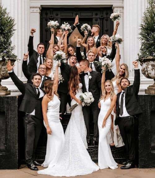 Pour un mariage en noir et blanc, je propose une autre option élégante : un ensemble entièrement noir et net pour le marié, offrant un contraste saisissant avec la robe élégante de la mariée. La combinaison de couleurs austères crée une atmosphère sophistiquée, rendant l’esthétique globale vraiment inoubliable.