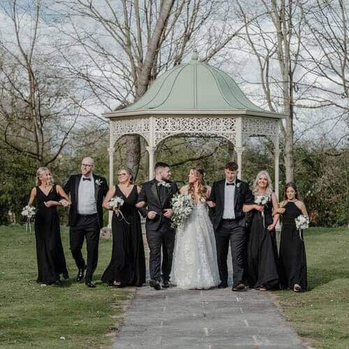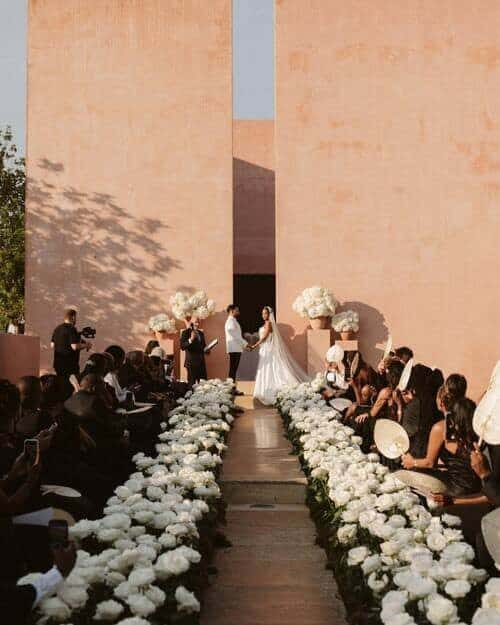 Pour créer un impact visuel mémorable, pensez à demander à tous les participants de porter une tenue noire. Le contraste saisissant entre le marié et son entourage majoritairement habillé en noir est indéniable. D’ailleurs, je suis impressionné par l’incorporation réfléchie de roses blanches formant l’allée – elle ajoute une touche d’élégance. Pour améliorer encore l’expérience des invités, l’intégration de ventilateurs portatifs peut être un geste astucieux, en particulier pour ceux qui seront assis à l’extérieur pendant la cérémonie.