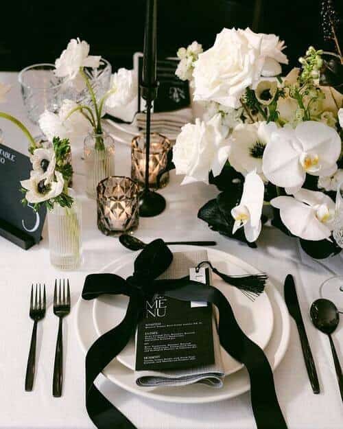 Élevez votre thème en noir et blanc en incorporant des couverts en noir et blanc dans le cadre de votre table. Le contraste saisissant entre les assiettes blanches et les couverts noirs élégants crée une combinaison visuellement attrayante qui ne manquera pas de faire une déclaration. Pour le relever d’un cran, pensez à ajouter une touche décorative comme un arc sur l’assiette pour une fioriture de finition.
