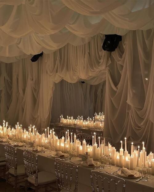 Dans ce cadre idyllique, l’essence d’un mariage blanc traditionnel est réinventée avec un air de fantaisie. Les chaises transparentes et les bougies de différentes hauteurs créent un sentiment de légèreté et d’espièglerie, comme si la pièce elle-même était imprégnée d’une touche de magie. Cependant, il est essentiel de s’assurer que toutes les sources de bougies sont totalement à l’abri des risques d’incendie.