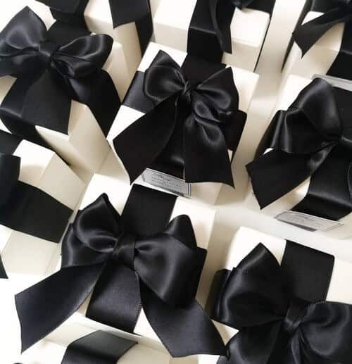 La deuxième idée de faveur de mariage sur le thème noir et blanc que j’aimerais souligner présente une touche réfléchie qui la rend vraiment unique. Les noms et la date du mariage du couple sont intelligemment incorporés dans le design, élevant ces humbles faveurs en souvenirs uniques qui seront chéris par leurs proches pour les années à venir.