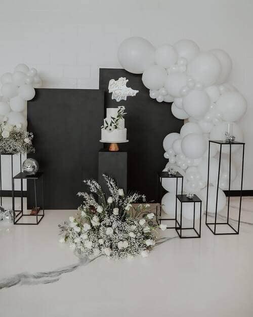 Le contraste saisissant du gâteau blanc avec le fond noir est indéniable. L’agencement de fleurs époustouflant sur le sol ajoute une touche d’élégance à l’esthétique globale. Les différentes hauteurs des socles créent un affichage visuellement attrayant. Avec 26 idées magnifiques pour un thème de mariage en noir et blanc, les possibilités sont infinies ! Vous pouvez ajouter vos propres touches uniques ou adapter ces idées pour créer un événement vraiment inoubliable.