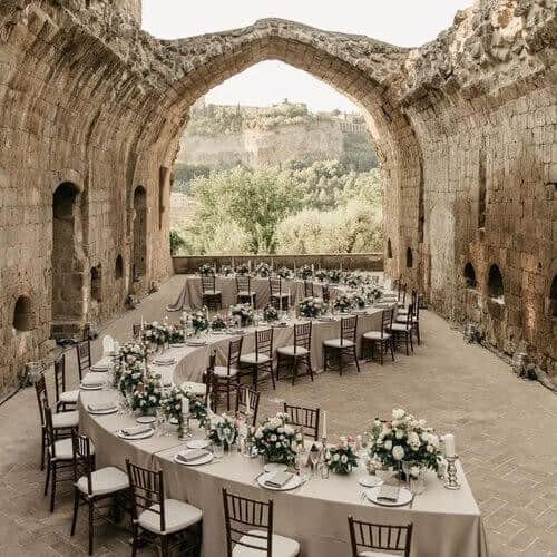 Le décor est planté pour une expérience vraiment inoubliable, qui rappelle une escapade italienne de rêve. La disposition de la table dégage un sentiment d’élégance et de raffinement, avec des roses blanches servant de couronnement à chaque décor. Qui plus est, l’espacement soigneusement réfléchi des chaises ajoute à l’ambiance générale, créant une atmosphère à la fois intime et invitante.