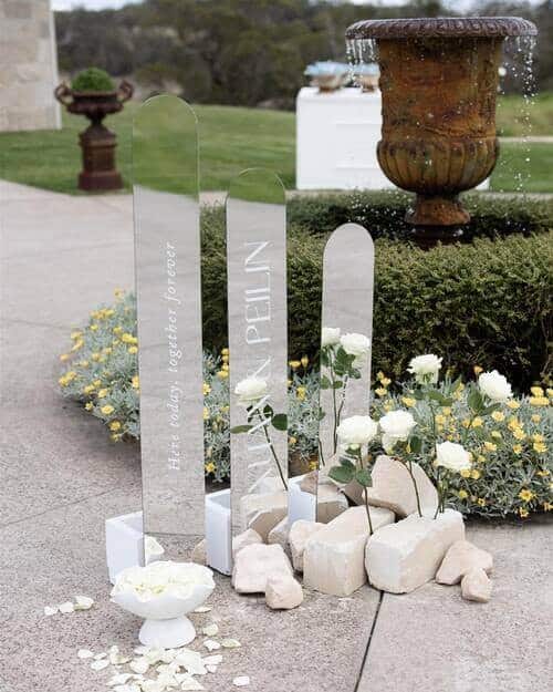 Consider incorporating an innovative design concept into your black and white themed wedding signage, where you feature roses seemingly sprouting from a stone base. This clever approach adds a touch of elegance to your overall aesthetic while also conveying a sense of natural beauty and growth.