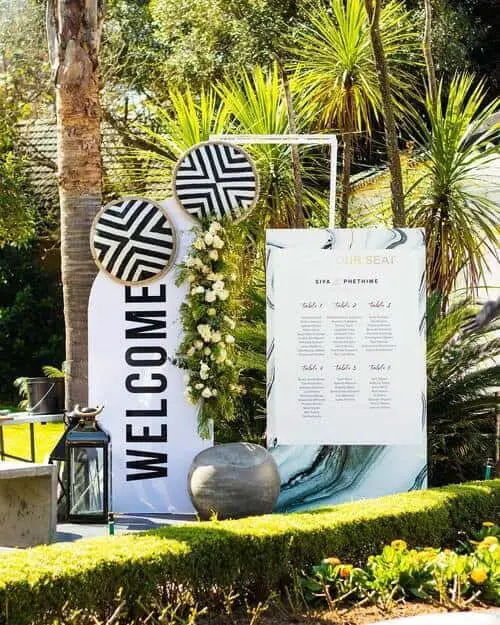 Incorporer un thème en noir et blanc dans votre signalisation de mariage est un excellent concept. L’un de ses plus grands avantages est la clarté qu’il apporte au plan des sièges, garantissant que chaque client sait exactement où s’asseoir. La conception surdimensionnée élimine efficacement toute confusion potentielle. De plus, l’association de la signalisation avec un grand bougeoir ajoute chaleur et ambiance à l’esthétique globale, créant une atmosphère accueillante.