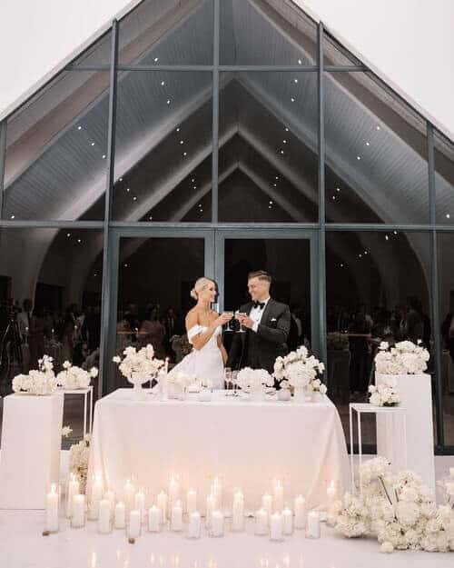 Ce qui attire mon attention dans cette jolie scène, c’est le sentiment de grandeur et d’intimité que le couple s’est organisé. La table séparée, positionnée pour attirer l’attention sur eux, sert de point focal intelligent en cette journée spéciale. La douce lueur des bougies à la base de la table ajoute une touche de romance à l’atmosphère. Je suis également impressionné par les détails réfléchis, tels que les supports à fleurs à plusieurs niveaux qui créent un intérêt visuel et ajoutent de la profondeur au cadre global.