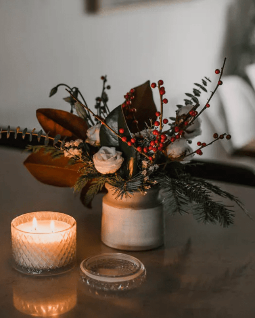 L’un des moyens les plus simples d’ajouter une ambiance festive à votre maison consiste à ajouter du feuillage frais de saison aux vases que vous possédez déjà. Ici, les conifères, les baies, l’eucalyptus et les roses blanches se réunissent pour former un bel arrangement.