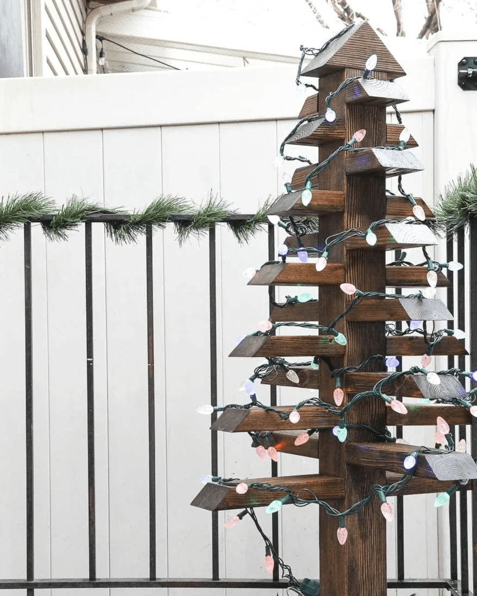 Répandez la joie des fêtes à l’extérieur de votre maison avec ce charmant sapin de Noël en bois composé de 2 x 4 pièces. Placez-le dans un seau festif, puis enfilez-le avec des lumières pour la touche finale !