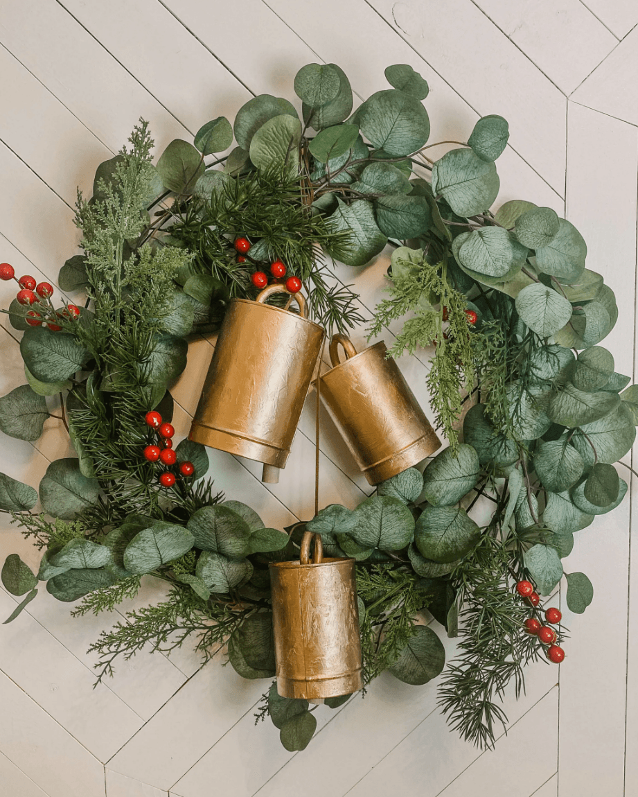Croiriez-vous que cette superbe couronne est fabriquée avec des matériaux provenant du magasin à un dollar ? Mélangez du faux eucalyptus et du feuillage persistant avec de petites baies rouges et incorporez des boîtes peintes à la feuille d’or pour une touche festive supplémentaire.