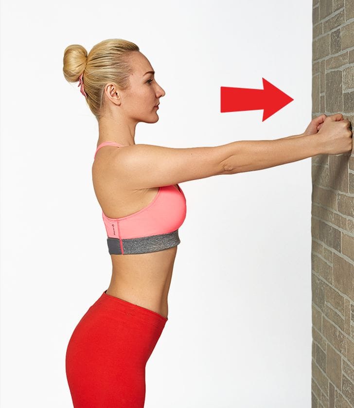 Tenez-vous à un demi-mètre d’un mur, étirez vos bras devant vous et commencez à vous appuyer dessus avec vos poings. Vous sentirez vos muscles pectoraux s’exercer. Appuyez pendant 20 secondes, puis reposez-vous pendant 10 secondes. Répétez 3 fois.