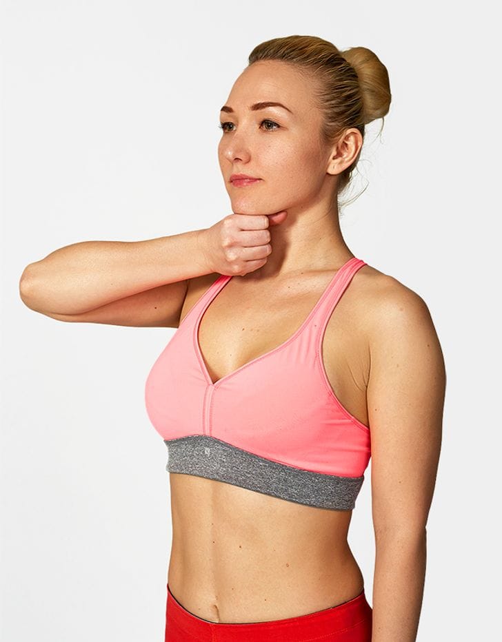 Serrez votre main en un poing et portez-le à votre menton. Appuyez sur votre poing avec votre menton pendant 5 secondes, puis détendez-vous pendant 5 secondes. Répétez 2-3 fois.