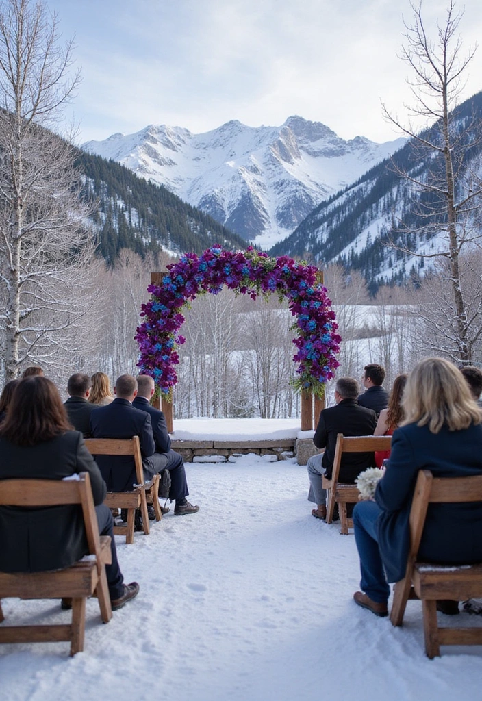 Imaginez votre cérémonie de mariage au cœur de majestueux sommets enneigés et de forêts luxuriantes, l’air pur des montagnes vivifiant vos sens. Pour sublimer ce cadre pittoresque, pensez à utiliser des orchidées aux riches tons de pierres précieuses pour créer des compositions florales saisissantes qui contrastent harmonieusement avec la nature environnante. Une réception intérieure peut être aménagée avec de grandes fenêtres offrant une vue magnifique sur les montagnes, garantissant ainsi à vos invités une ambiance chaleureuse et confortable tout en profitant du paysage.