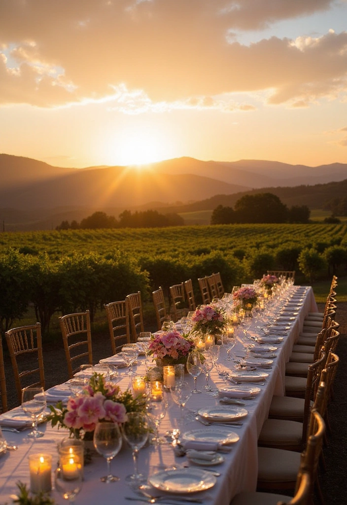 Pour une réception en plein air, imaginez de longues tables de banquet ornées de magnifiques compositions d’orchidées et baignées d’une douce lueur vacillante aux bougies, créant une atmosphère romantique au coucher du soleil sur la vallée. Pour vous aider à planifier cet événement de rêve, consultez les guides d’organisation de mariages en région viticole, qui offrent de précieux conseils et astuces. N’oubliez pas de personnaliser votre célébration avec des touches uniques, comme des étiquettes de vin personnalisées qui reflètent votre histoire d’amour, pour une expérience mémorable que vous et vos invités chérirez à jamais.