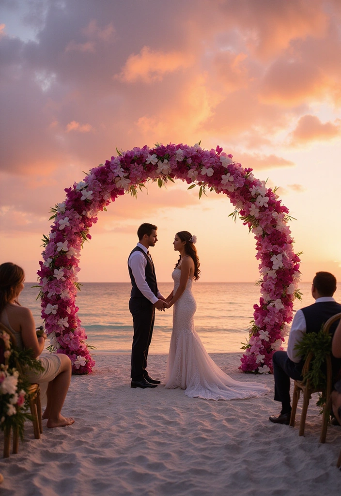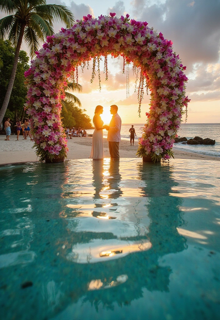 Imaginez une cérémonie magique au coucher du soleil, avec le ciel se métamorphosant en de magnifiques teintes orange et rose, tandis que vous et votre partenaire vous tenez sous une arche ornée d’orchidées exquises, entourés de vos proches. Après la cérémonie, célébrez l’événement avec un dîner privé sur la plage, agrémenté d’un menu gastronomique et de champagne pétillant servi dans d’élégants verres.