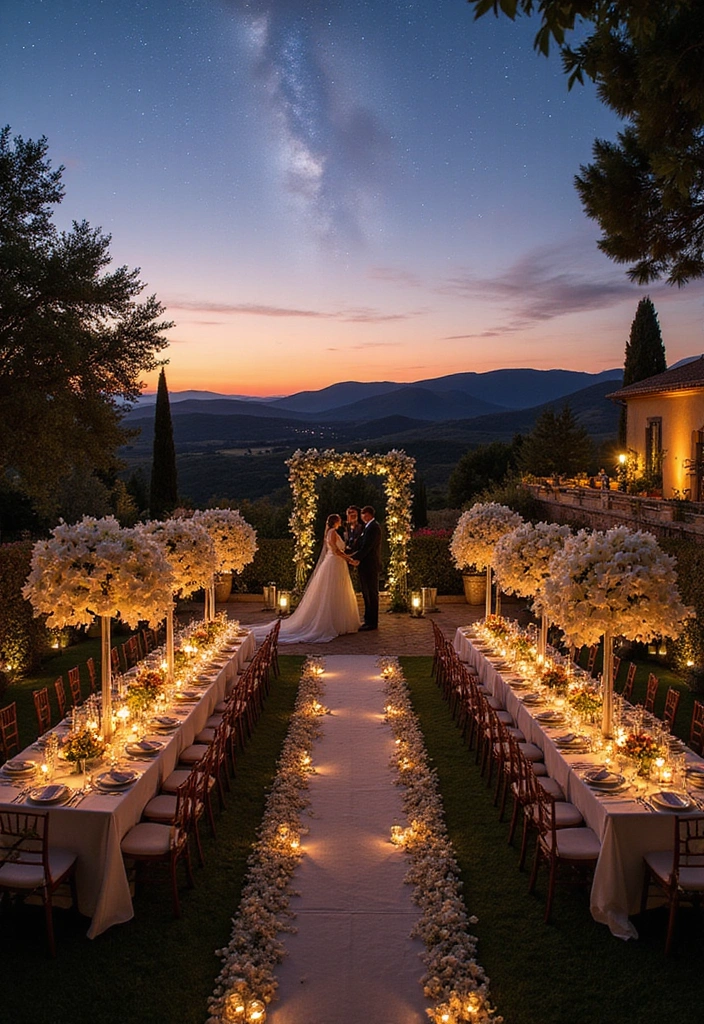 Pour la réception, un délicieux dîner de la ferme à la table, composé d’une cuisine italienne locale exquise et de vins fins de la région, serait parfait. Une célébration en plein air sous un ciel étoilé, ornée de lumières scintillantes et de magnifiques centres de table ornés d’orchidées, promet une soirée magique, pleine de joie et d’amour. Avec l’ambiance enchanteresse et le riche patrimoine culturel de la Toscane, votre mariage laissera assurément un souvenir inoubliable à tous les invités. N’hésitez pas à faire appel à des traiteurs locaux pour que vos invités savourent le meilleur de la gastronomie locale.