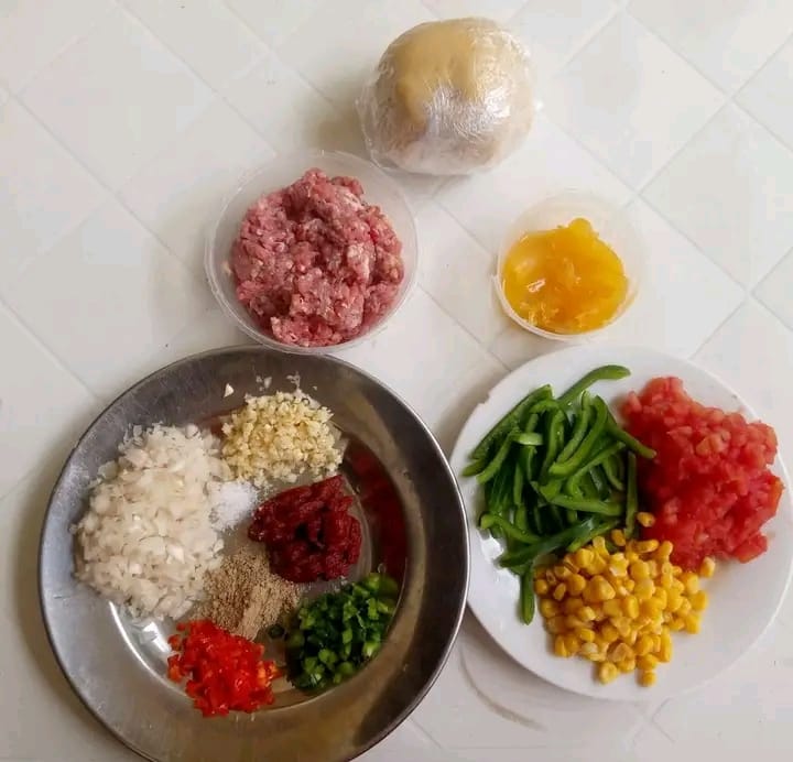 Ajouter la farce ( hâchis préparé) au fond, ensuite étaler tout à tour poivron , tomates et maïs doux