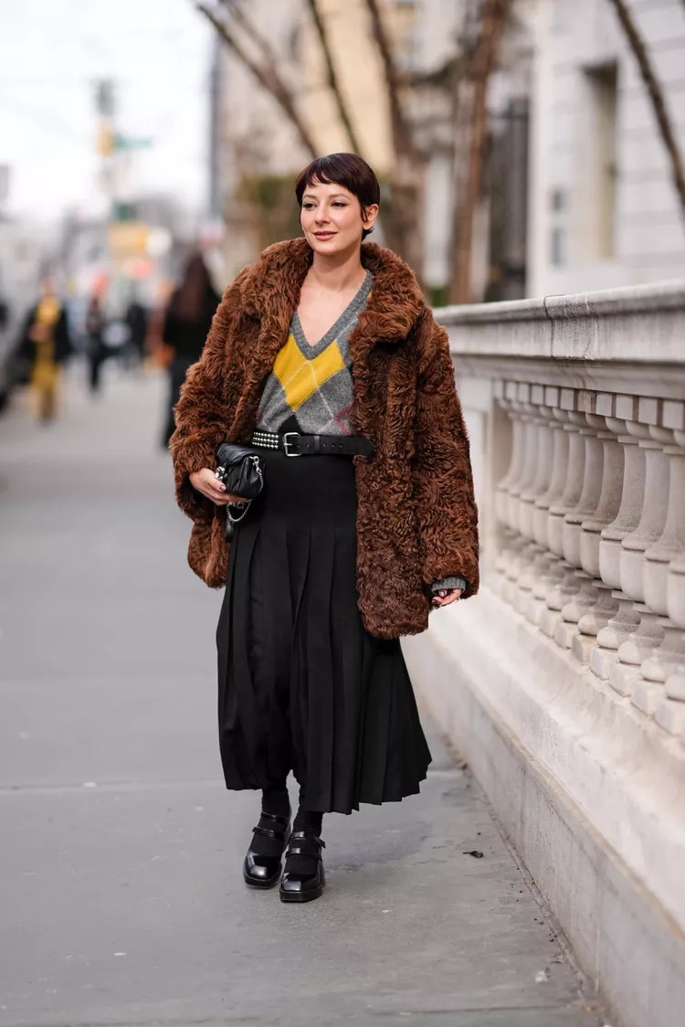 La ville regorge de trouvailles vintage impeccables et la friperie est pratiquement un sport. La capacité à mélanger des pièces vintage avec des vêtements plus récents est une caractéristique distinctive du style new-yorkais. La combinaison du foulard en soie et du manteau en fourrure donne un air de trouvailles vintage précieuses.