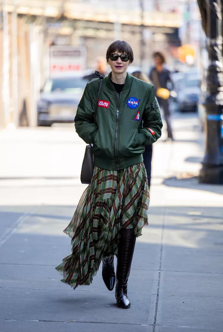 Étant dans la capitale de la mode, les New-Yorkais ont l’avantage d’être à la pointe des tendances. Une veste bomber avec des patchs de vol qui évoquent davantage le style urbain, associée à une jupe à carreaux traditionnelle en mousseline, est un équilibre de contrastes. La coordination des couleurs est essentielle pour adopter plusieurs tendances et c’est un parfait exemple de maîtrise de deux en une.