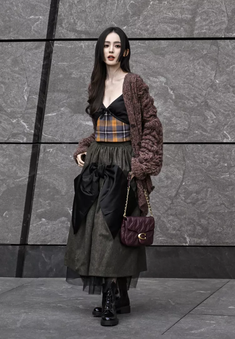 Mélanger les motifs est une chose, mais superposer les textures en est une autre. C’est une étude de cas en matière de style et d’équilibre. Le long cardigan épais sur un bustier à carreaux en twee se coordonne bien avec le tulle et le volant de la jupe. Des bottes de combat noires donnent au look une autre dimension de texture supplémentaire.