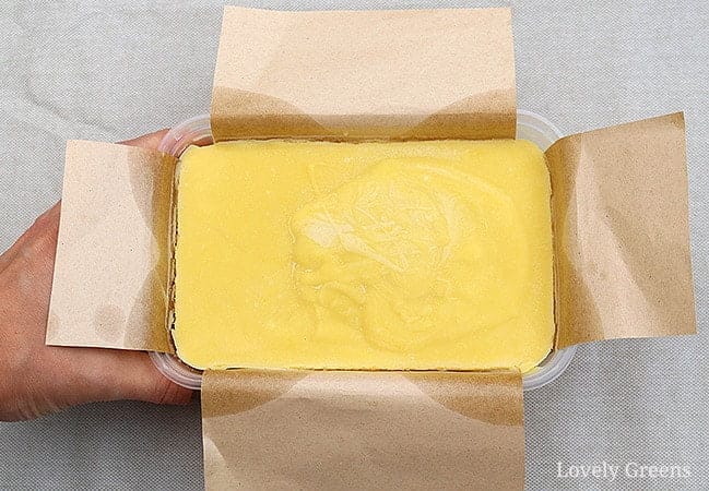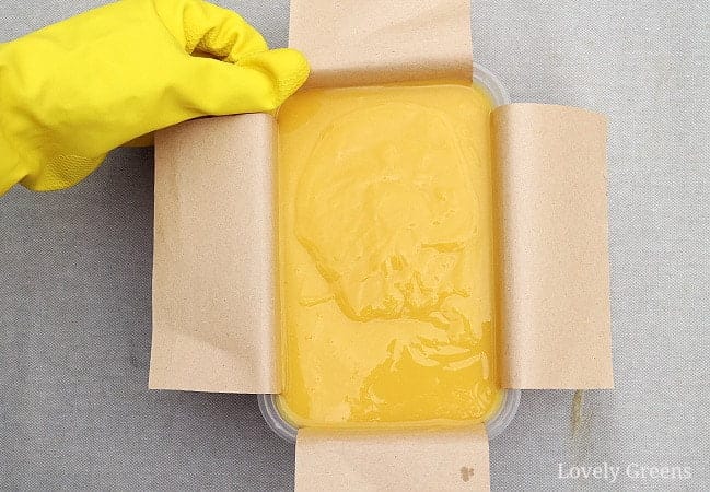 - Versez le savon dans le moule et placez-le sur une surface résistante à la chaleur. Je fais généralement passer le mien au four (froid) au moins une nuit. Laissez le savon dans le moule pendant au moins deux jours. Une semaine pourrait être encore mieux car il s’agit d’un savon doux au départ. Les recettes de savons riches en huile d’olive extra vierge ont tendance à commencer mollement et à devenir très dures au cours de la phase de durcissement.