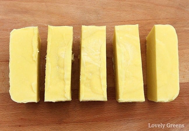 - Une fois ce temps écoulé, vous pouvez retirer le savon et le couper en barres. Utilisez un couteau de cuisine ordinaire et si vous trouvez que le savon est collant, arrêtez-vous et laissez le savon reposer pendant quelques jours de plus. C’est un savon riche en huile d’olive et très riche en eau. Il sera collant et mou au début, mais avec le temps, il durcira.