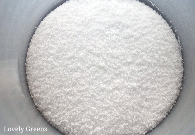 - Dissoudre les cristaux de lessive (hydroxyde de sodium) dans l’eau. Dans un endroit aéré, versez les cristaux de lessive dans l’eau et remuez bien. Je préfère faire cette étape à l’extérieur lorsque cela est possible à cause de la vapeur qui s’en dégagera au départ. Ce n’est pas agréable si vous le respirez accidentellement, alors évitez cela en tenant la cruche bien loin de vous.