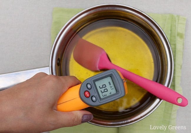 - Mesurer les températures de l’eau de lessive et des huiles. Vous devriez viser à les refroidir tous les deux à environ 100°F / 38°C. Vous n’avez pas besoin d’être sur le point, mais essayez de les avoir à cette température ou légèrement plus fraîche.