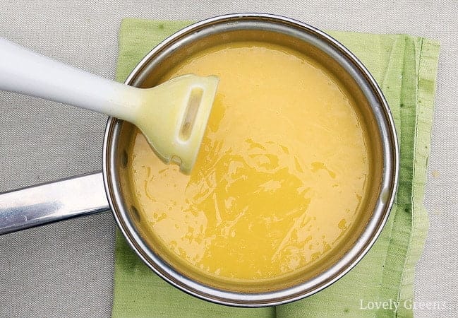 - Trempez votre mixeur plongeant dans la casserole et, éteint, remuez le mélange. Ensuite, amenez-le au centre de la casserole et avec vos deux mains, tenez-le au fond de la casserole et blitzez-le pendant quelques secondes seulement. Éteignez-le et remuez la pâte à savon, en utilisant le mélangeur comme une cuillère. Répétez jusqu’à ce que le mélange épaississe jusqu’à ‘Trace’. C’est à ce moment que la pâte laisse des traces visibles à la surface. La consistance ressemblera à une crème pâtissière au début, mais elle s’épaissira rapidement, alors assurez-vous de travailler rapidement après ce point.