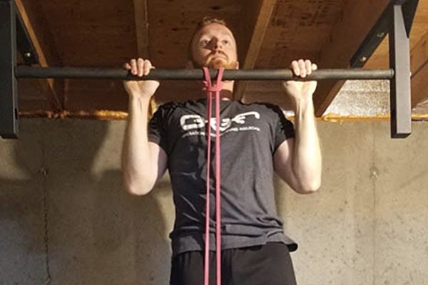 - Pour le pullup assisté, placez-vous sur la plate-forme d’une machine de pullup et saisissez fermement les poignées de la machine. Pour un pull-up sans assistance, commencez par le bas d’une position de pull-up.